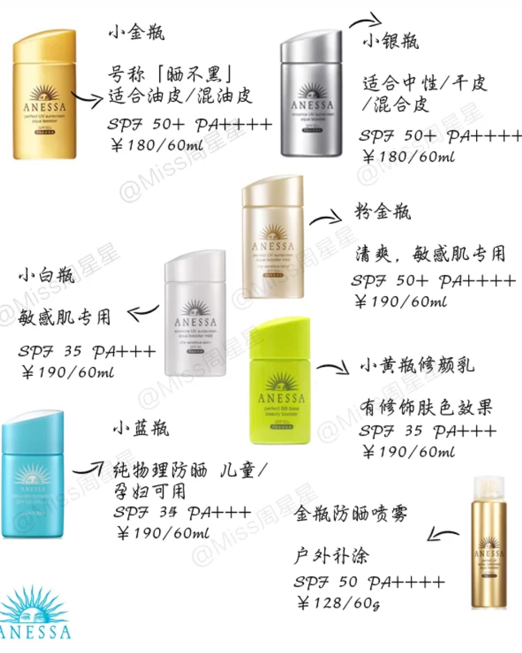 安耐曬的地位我就不用多說了吧?很多人都用過,我也是一入夏就會囤它。感覺沒有它,整個夏天都過得不安心了。從圖中我們可以看到安耐曬的不同系列,以及功,金色的是大眾通常會選購的一款。當然,具體還是需要根據膚質選擇。如果你有經濟條件的話,我更加建議把安耐曬當作身體防曬來用,尤其是去旅游的時候,沒有它感覺人都快變成碳了哈哈。