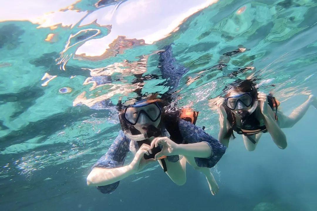 水真的又清澈又藍(lán)??!換上船員發(fā)放的面鏡、呼吸管、救生衣,我們兩個(gè)先跳下去潛水。