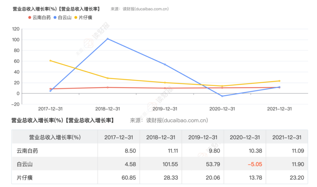 近幾年,云南白藥營收增速放緩,增速維持在10%左右,同為中藥龍頭的片仔癀的營收增速在20%左右。