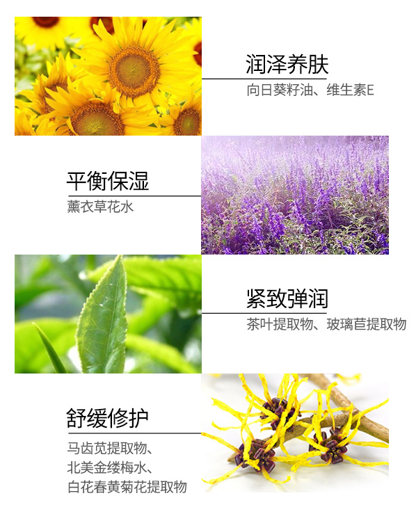 添加多種植物成分:向日葵油、玻璃苣提取物、母菊花提取物、北美金縷梅水、薰衣草花水等