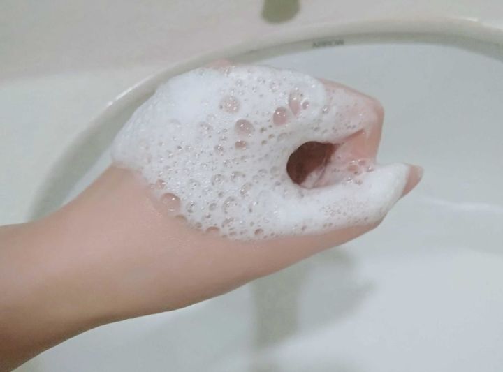 擠出一點點在氣泡往上,再加點水就可以打出很多泡泡!綿綿密密的,像奶油一樣~而且在手掌心不容易掉下來!倒杯不灑說的應該就是這種果了吧~