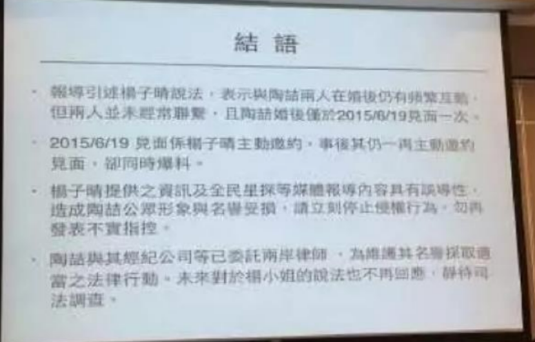 陶喆專門為此開了演唱會(huì),把他和楊子晴之間的婚外情按照時(shí)間表做成了PPT,文情并茂地作了一翻解釋,但道謙的誠(chéng)意不足,而深情表白老婆有余,他后還寫了結(jié)語(yǔ),跟職場(chǎng)的報(bào)告總結(jié)一般。