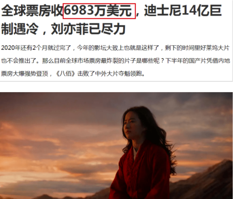 至此,劉亦菲的資源眼見的變少了,投資14億拍攝的電影《花木蘭》也撲街了。
