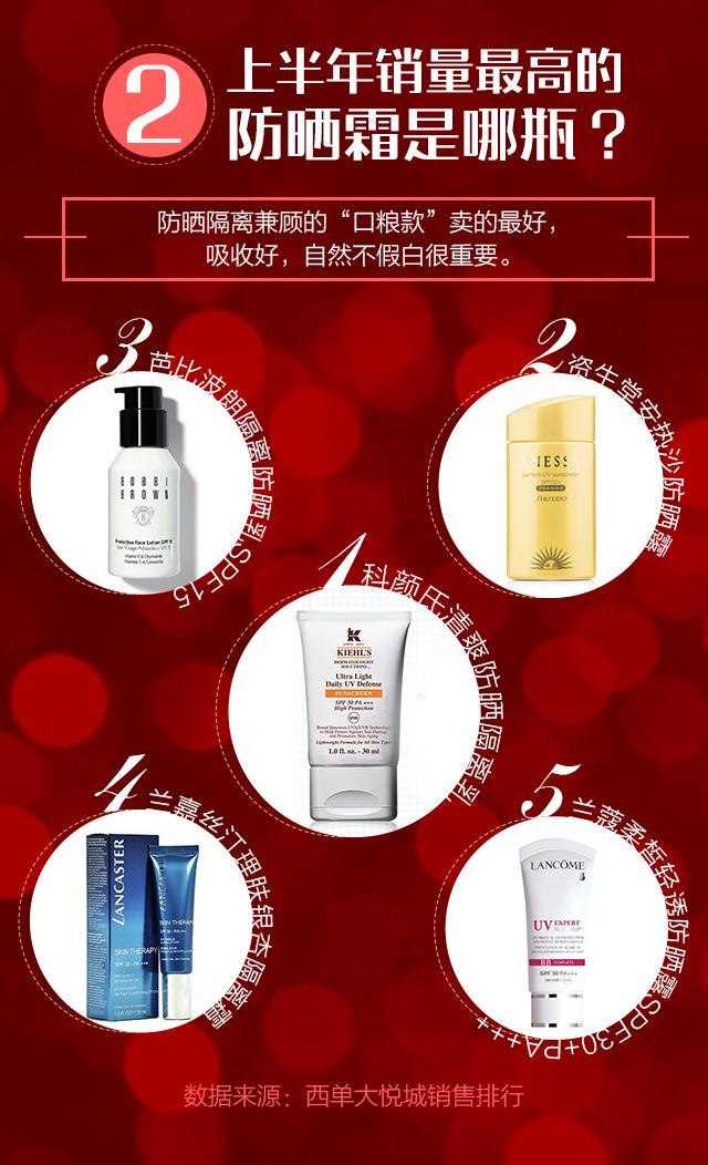 這是來自西單大悅城的銷售數(shù)據(jù),上半年防曬霜銷售前五名??壳暗亩际侨粘S玫摹翱诩Z款”防曬隔離,不管是防陽光、防霧霾還是隔離抗氧化都是少不了的。