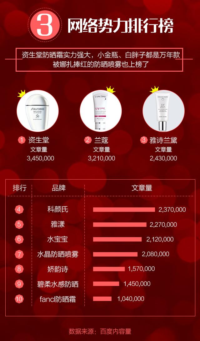 這是來自百度的數(shù)據(jù),綜合了各家防曬霜品牌,文章量排名前十的防曬霜。其實(shí)結(jié)果和我們剛才看到的很像,資生堂的白胖子、周冬雨代言的蘭蔻還有雅詩蘭黛占據(jù)了前三名。