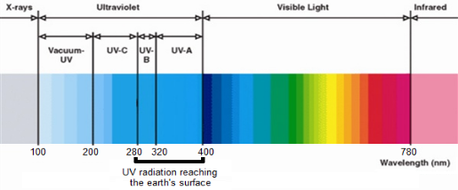 穿過大氣層的紫外光范圍按照波長可分為兩種輻射波段:紫外線B(UVB,280 - 320nm)和紫外線A(UVA,320 - 400nm)