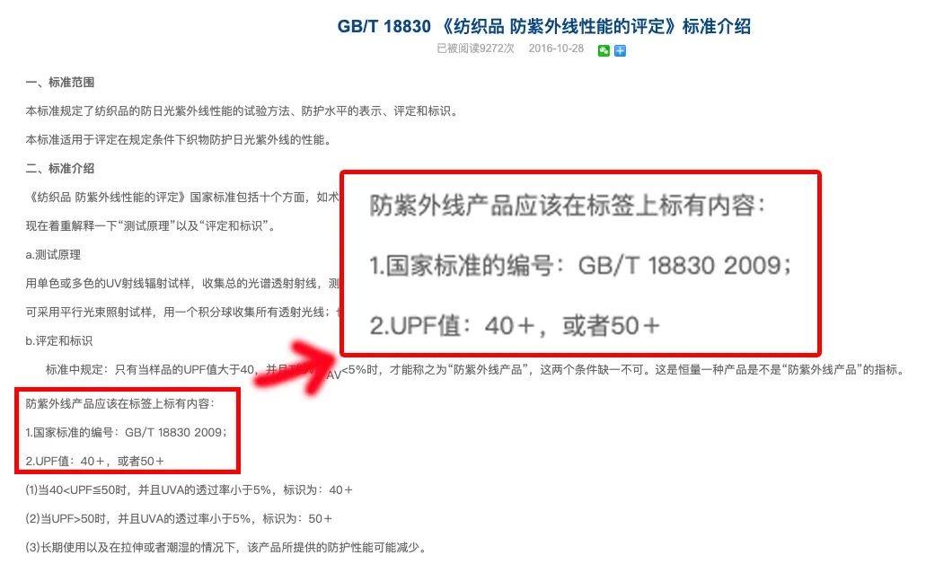 規(guī)定正版的防紫外線產(chǎn)品,UPF≥40,且必須注明標(biāo)準(zhǔn)編號(hào)GB/T 18830-2009。