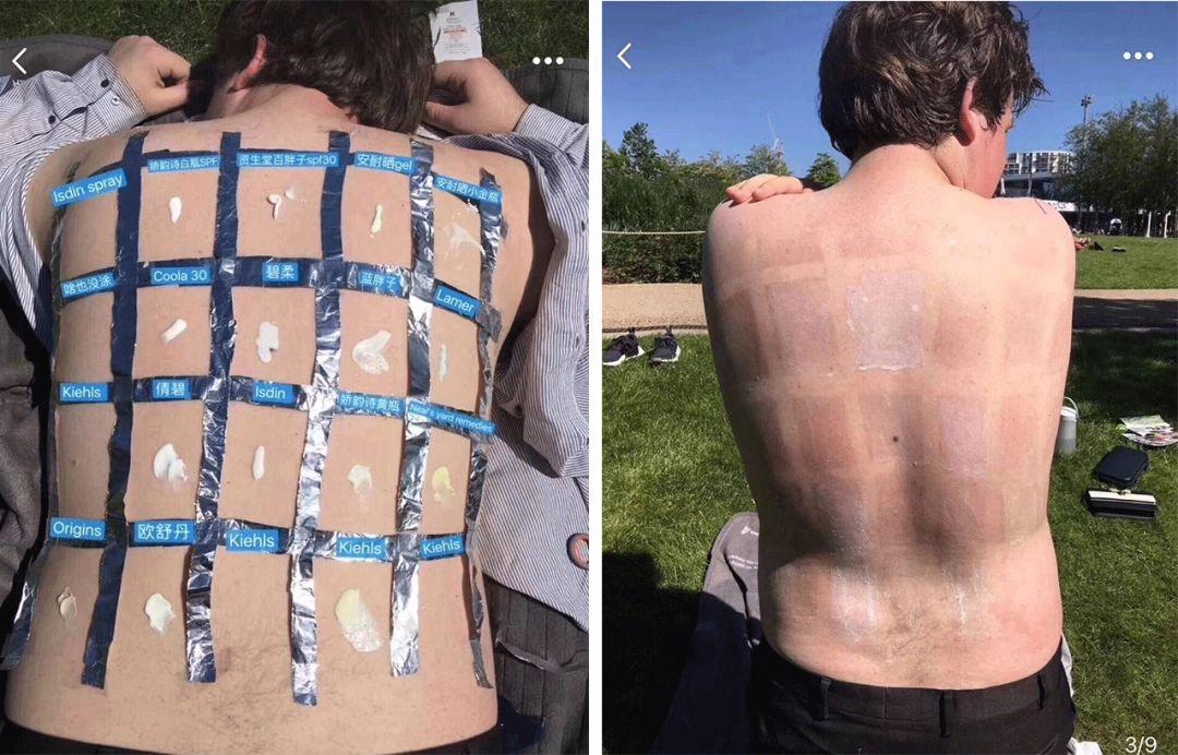 看看下圖這個(gè)做防曬測評(píng)的硬核小哥,在自己背上涂了15款防曬霜,再到太陽下山。