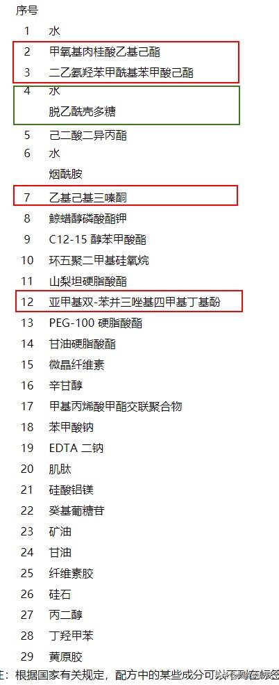 圖中紅框框起來的成分,是這款防曬霜使用的四種防曬劑,全部是化學(xué)防曬劑。翻遍整個(gè)成分表,也沒有找到植物來源的防曬劑。只找到綠框中的“脫乙酰殼多糖”,這個(gè)成分確實(shí)是生物工程來源,上文已經(jīng)講過。