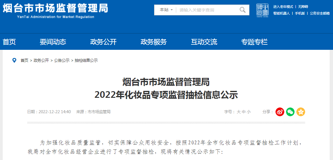 中國質(zhì)量新聞網(wǎng)訊 近日,山東省煙臺(tái)市市場監(jiān)督管理局發(fā)布2022年化妝品專項(xiàng)監(jiān)督抽檢信息公示。