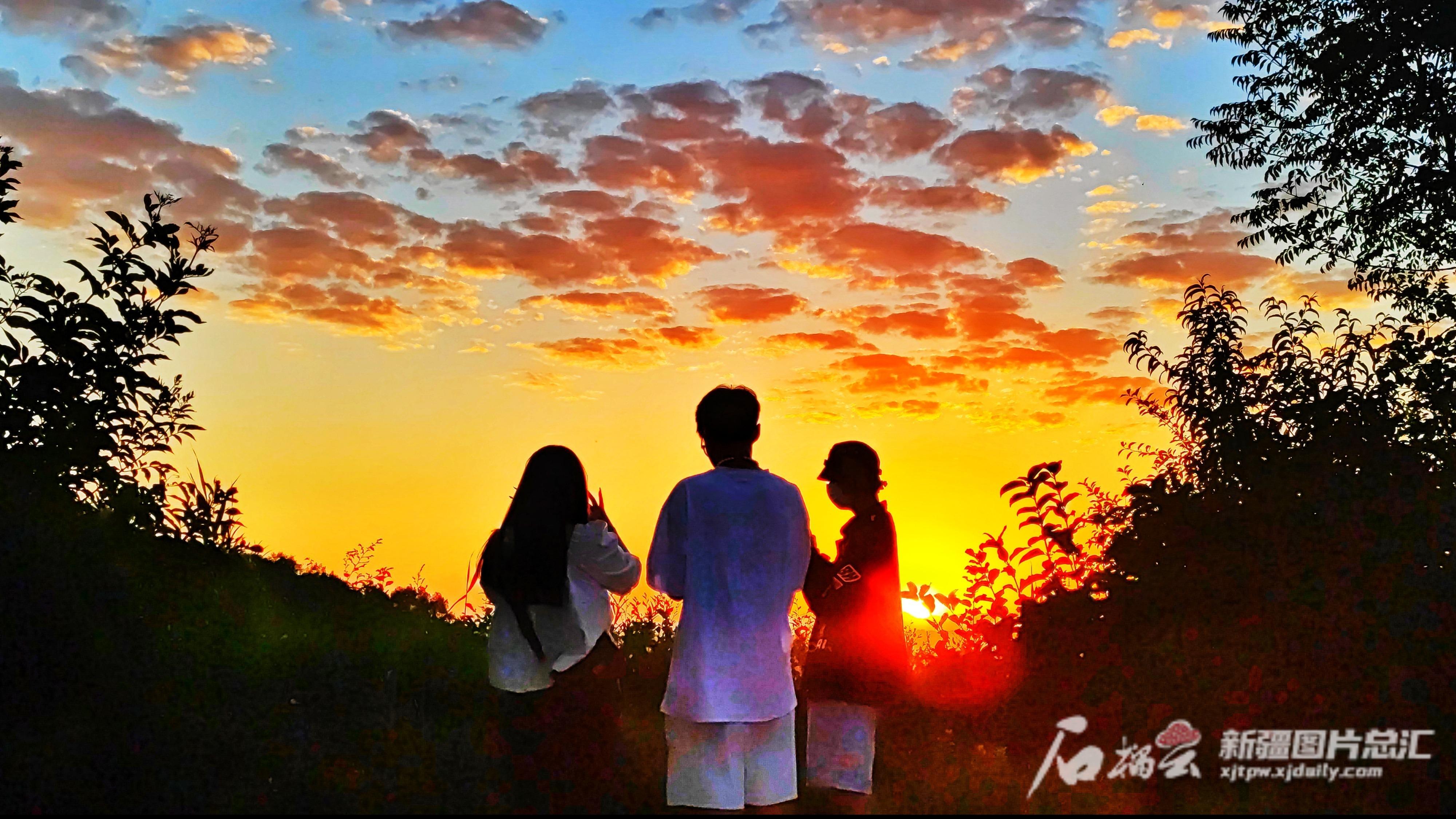 7月28日早晨,烏魯木齊天氣晴朗,朝霞映紅了云朵,幾名年輕人在雅山公園觀賞日出。石榴云/新疆日?qǐng)?bào)記者 張萬德攝