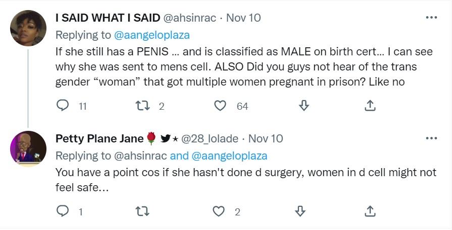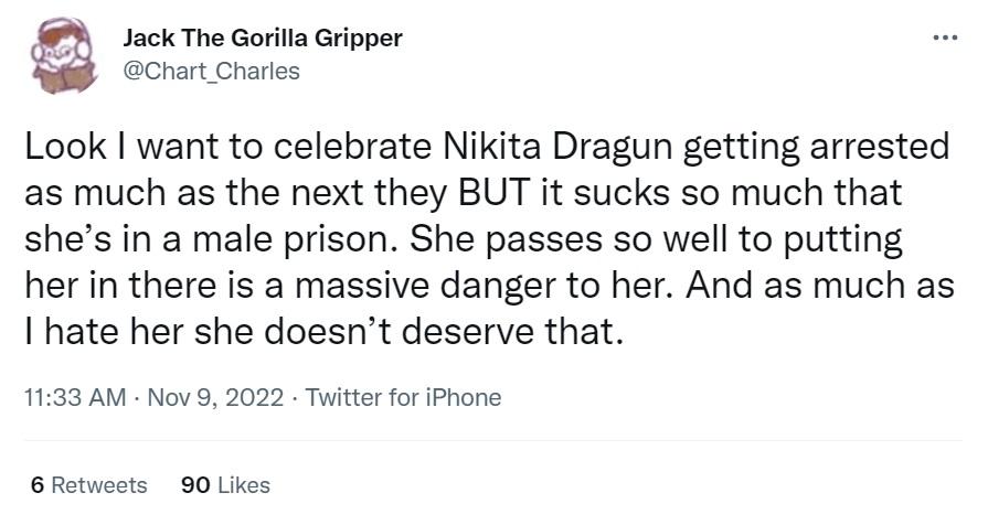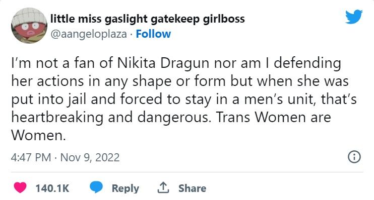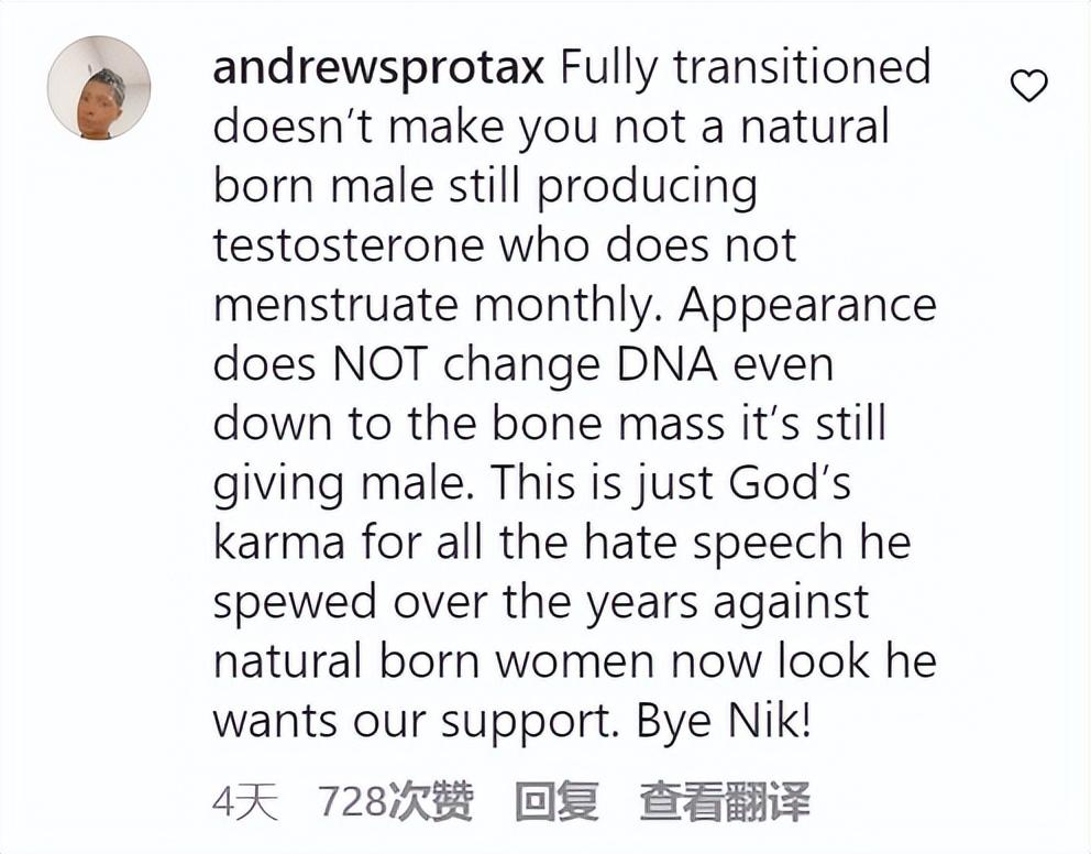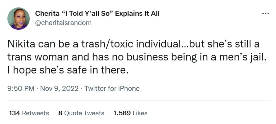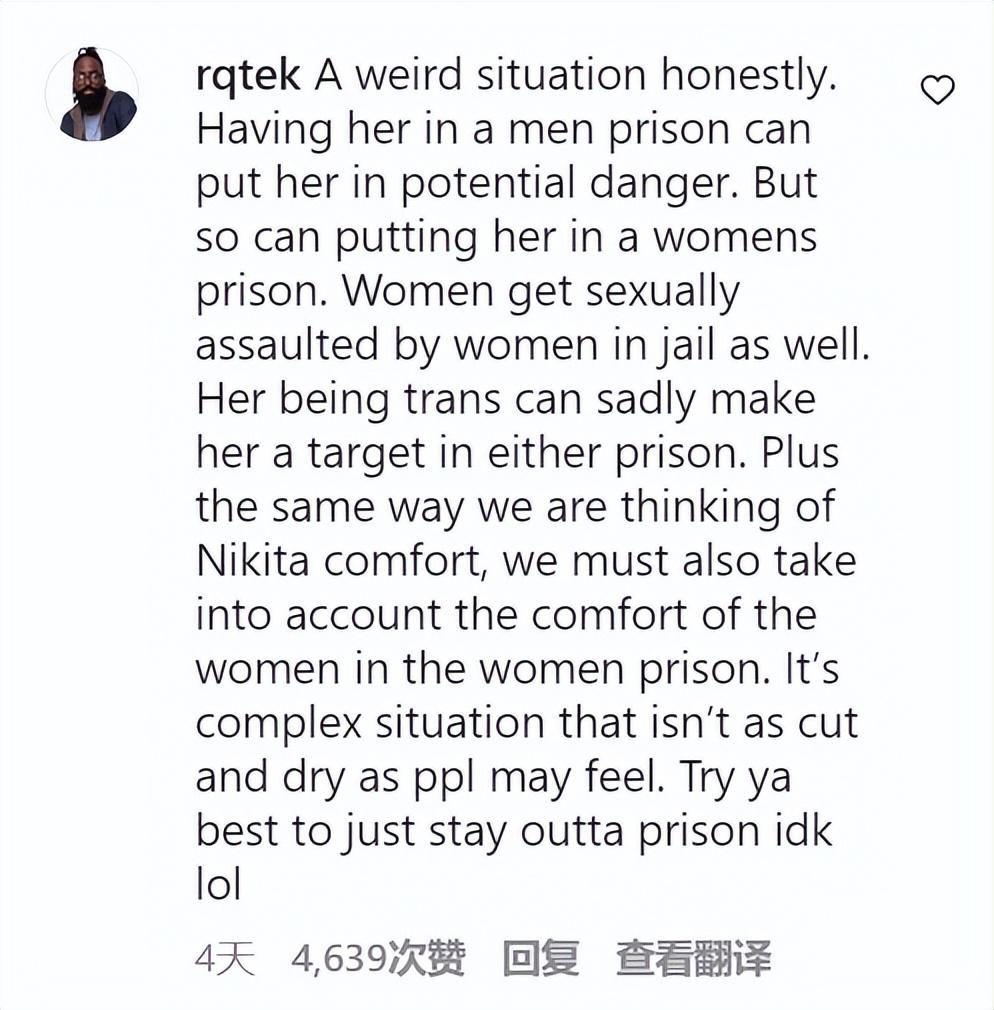 “尼基塔是垃圾,她確實(shí)有毒……但是她仍然是一個(gè)跨性別女,怎么可以把她放到男子監(jiān)獄。真希望她在那里沒(méi)事。”