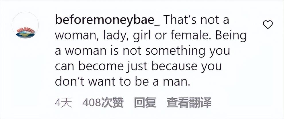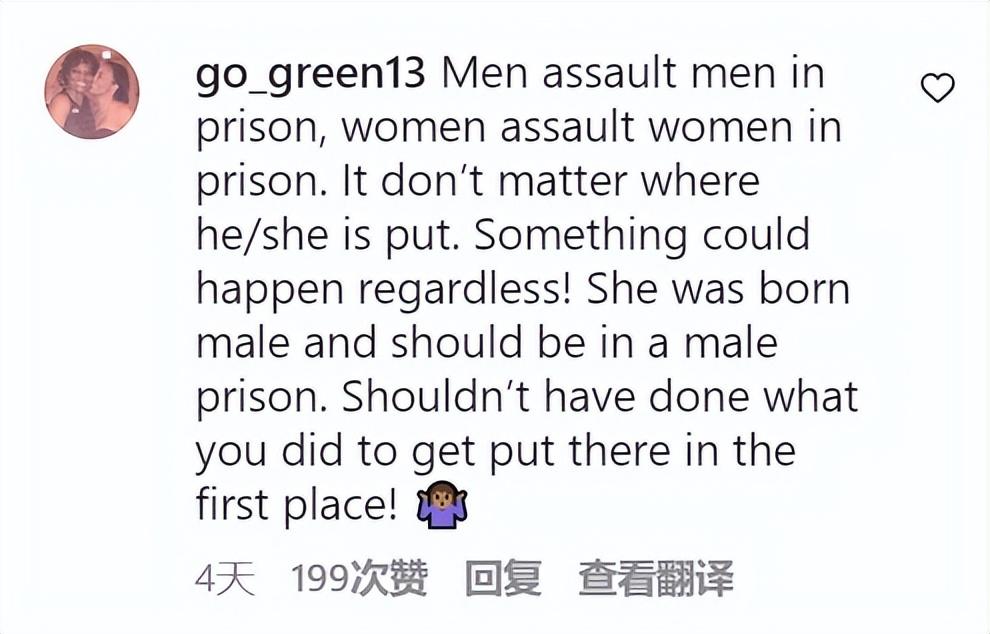 有人提到在美國(guó)監(jiān)獄,去哪里都危險(xiǎn),所以沒(méi)差別?!霸诿绹?guó)監(jiān)獄,男人侵犯男人,女人侵犯女人,把他/她關(guān)哪里都沒(méi)差別。無(wú)論如何總會(huì)發(fā)生一些事!他出生時(shí)是個(gè)男人,那就應(yīng)該被當(dāng)作男人來(lái)對(duì)待。從一開始就不應(yīng)該做犯罪的事呀!”