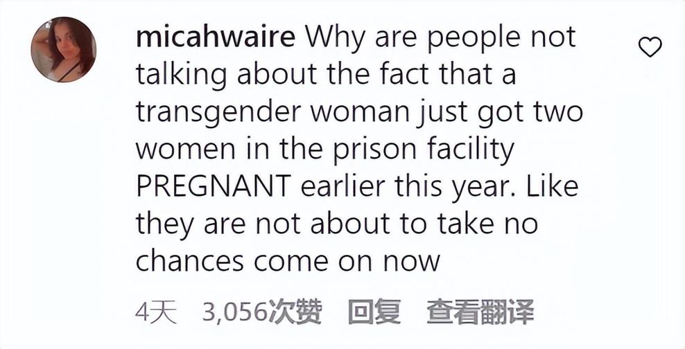 “為啥沒(méi)人說(shuō)今年初,一個(gè)跨性別女關(guān)到女子監(jiān)獄后,把兩個(gè)女囚搞懷孕了?看來(lái),他們這次不敢冒險(xiǎn)?!?/span>