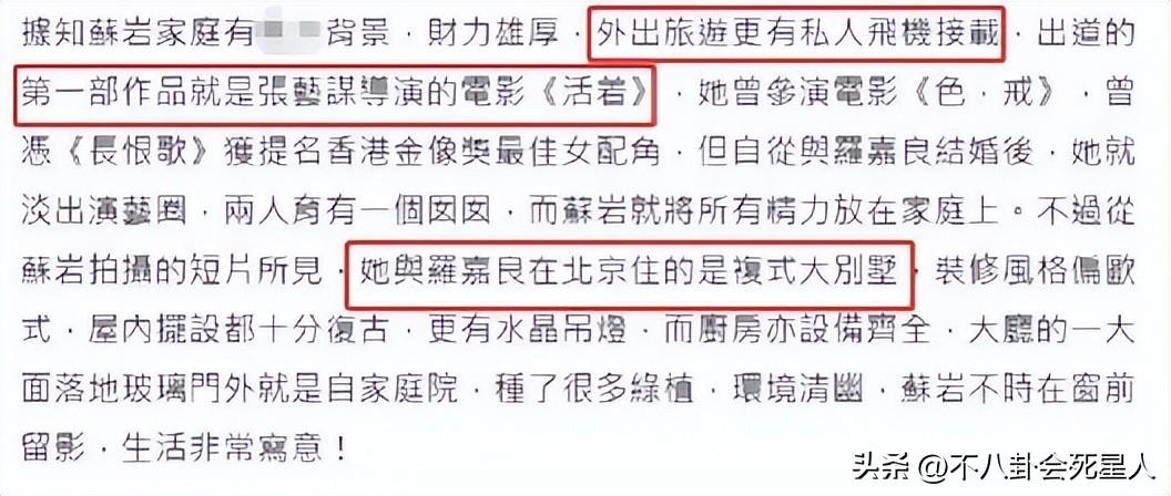 羅嘉良和蘇巖婚后過著富裕的生活,羅嘉良本人在娛樂圈打拼多年,名下資產(chǎn)自然是不會少,再加上投資的積累,完全可以給蘇巖很好的生活條件。再說蘇巖,被曝光家世顯赫,住在北京別墅不說,還擁有私人飛機。