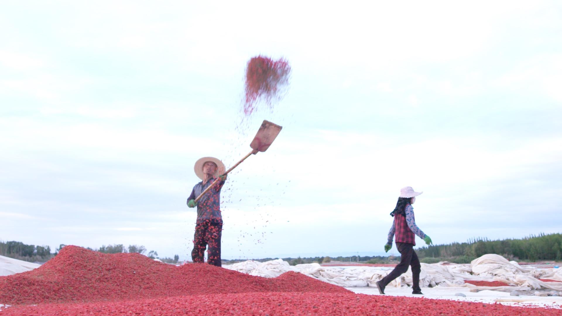 傍晚,起風了。小哥臉上帶著豐收的喜悅,將枸杞撒向空中,讓風把葉片吹走。反復多次,留下的只有枸杞。