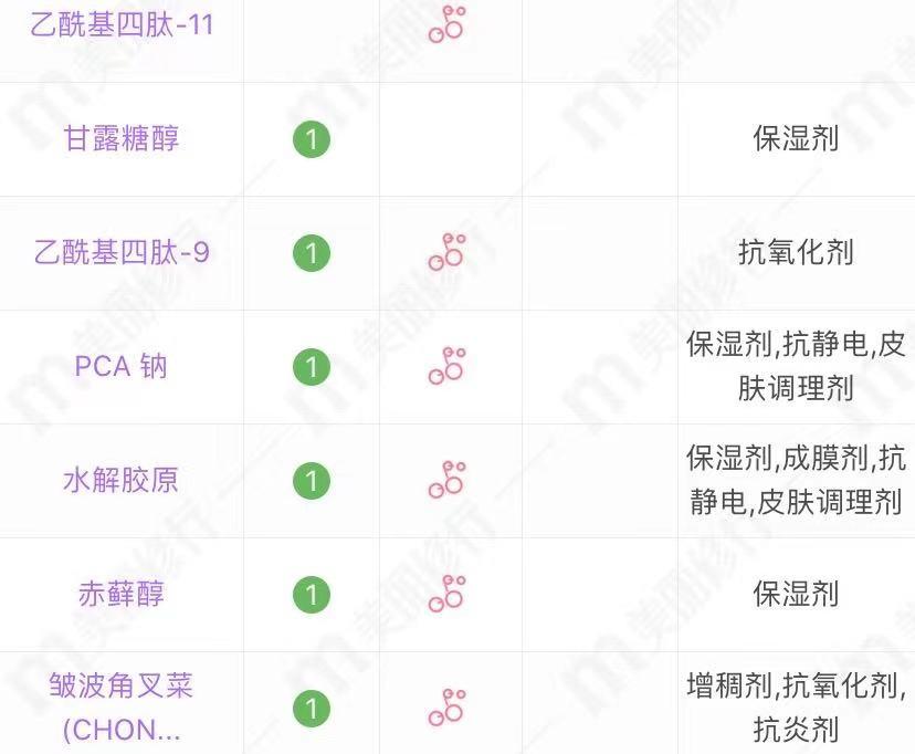 圖為部分成分,五種勝肽成分還有其他四種,五種復配使用會讓緊致果更。紅寶石面霜的其他成分也是主打溫和,保濕力度對于非干皮很夠用,也不容易導致不耐受泛紅,對敏感肌也很友好。