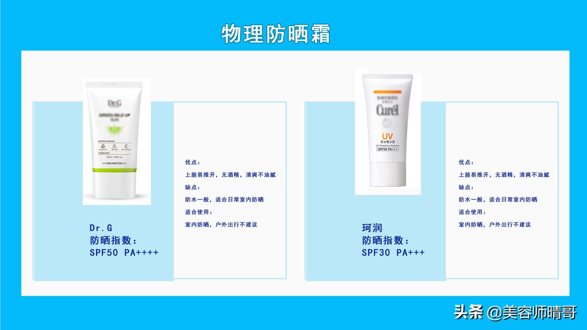理論上來說,物理防曬的成分會一覺溫和一些,而且防曬力度也很強,但是缺點就是容易堵塞毛孔,適合干皮和敏感肌,不推薦油皮,痘痘肌使用。但是油皮和痘痘肌可以使用化學防曬霜。