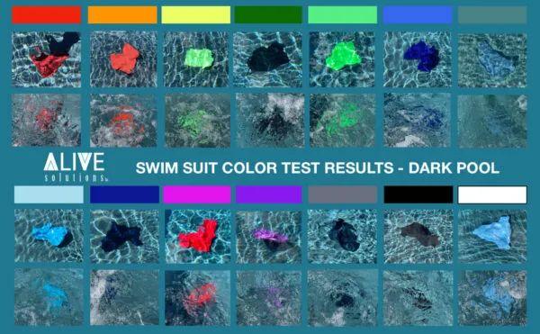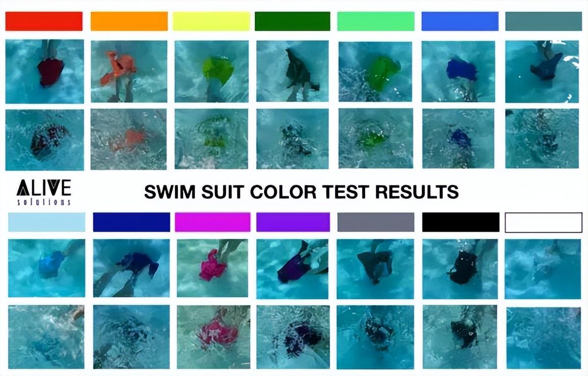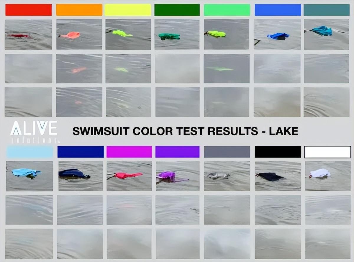 國外一家專業(yè)水上、培訓和風險評估公司(Alive Solutions),測試了 14 件各種顏色的泳衣在深淺底色游泳池和湖中的度。
