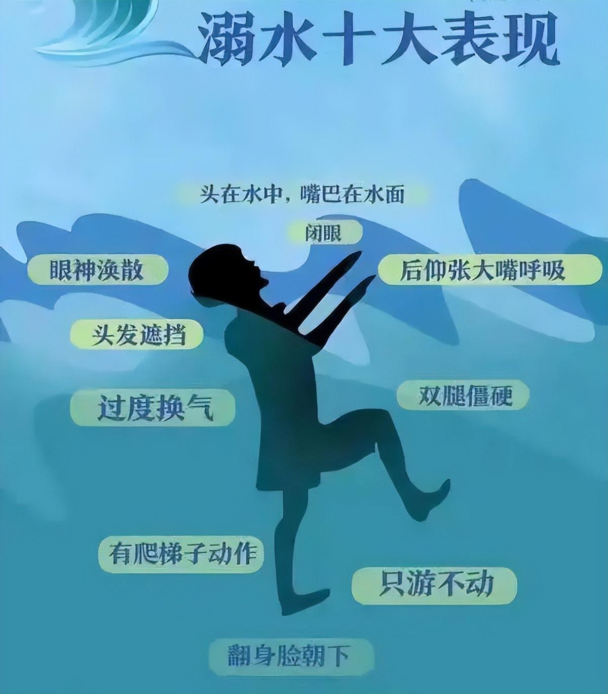 突然安靜無聲,嘴沒入水中。手臂可能前伸,但無法劃水向他人移動。在水中直立、不能踢腿,往往掙扎20-30秒之后沉下去。眼神呆滯或是閉著眼睛,頭發(fā)可能蓋在額頭或眼睛上。可能會頭后仰,嘴巴張開,有的孩子頭可能前傾。看起來像在抬頭看天空、岸際、泳池邊或碼頭。如詢問無反應、眼神渙散,就需要立刻伸出援手。