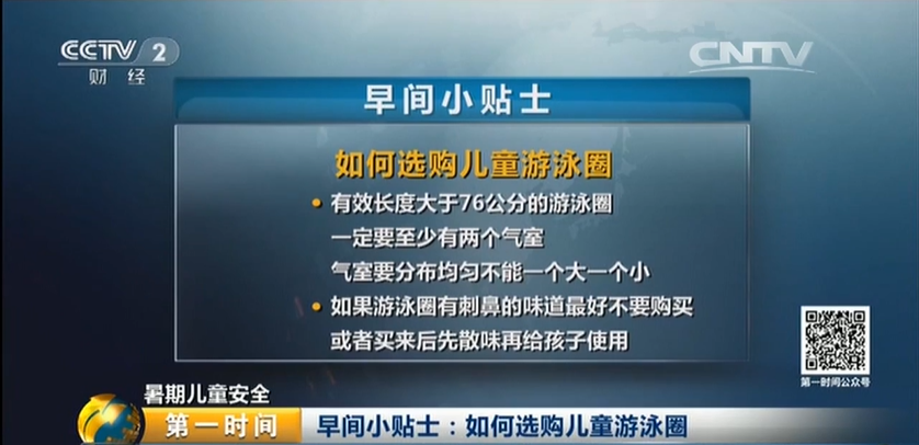 提醒,購買游泳圈不能只看款式、尺寸,也不能只看它是否漏氣,重點還要看浮力,需要參考孩子的年齡和體重,選擇品牌游泳圈。