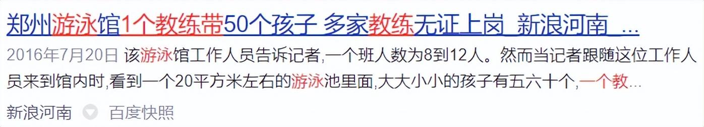 合肥8歲女孩,在僅有80公分深的泳池學游泳溺亡,他的教練,當時帶了20多個孩子訓練。鄭州這個一次帶50個孩子的,也是相當“厲害”了,想想就很危險。