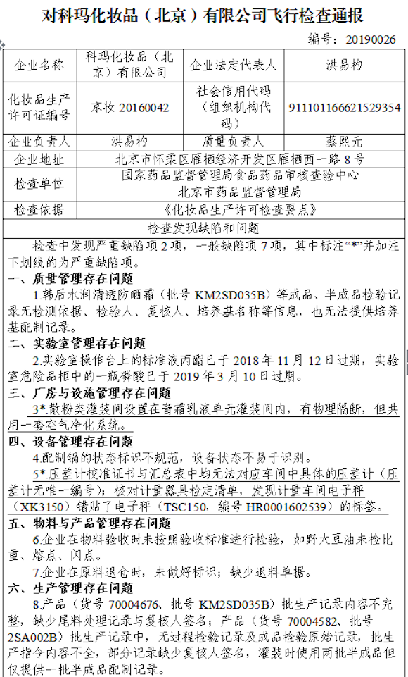 國產(chǎn)美妝品牌“韓后”的OEM(Original Equipment Manufacturer即貼牌生產(chǎn))企業(yè)科瑪化妝品(北京)有限公司(以下簡稱“科瑪”),因存在嚴(yán)重缺陷2項(xiàng),一般缺陷7項(xiàng),涉及質(zhì)量管理、實(shí)驗(yàn)室標(biāo)準(zhǔn)液過期、廠房設(shè)施、設(shè)備管理等多項(xiàng)問題,情節(jié)嚴(yán)重,被責(zé)令限期整改。