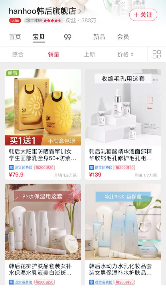 韓后天貓旗艦店中,這款售價(jià)79.9元的產(chǎn)品的銷量居于首位,月銷量達(dá)1.8萬筆。