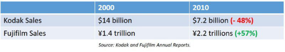 2000-2010年,膠片市場下降到不到10%,柯達的銷售額下降了48%,而曾經(jīng)60%的銷售額來自膠片的富士卻成功轉(zhuǎn)型,并在這十年內(nèi),收入增長了57%。