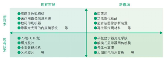 例如富士依托于既有技術,選擇生物醫(yī)藥、化妝品、高性能材料等成長可能性較大的領域,并在數(shù)碼影像行業(yè)、光學元器件行業(yè)、高性能材料行業(yè)、印刷系統(tǒng)行業(yè)、文件處理行業(yè)、醫(yī)療生命科學等行業(yè)轉(zhuǎn)型或開拓。