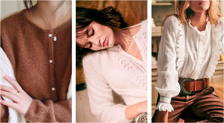 Sézane的衣服柔軟親膚,有著細(xì)致的蕾絲和紋理設(shè)計(jì),實(shí)穿性很強(qiáng),是在略帶寒意的秋冬季節(jié)衣櫥里常備的老朋友~