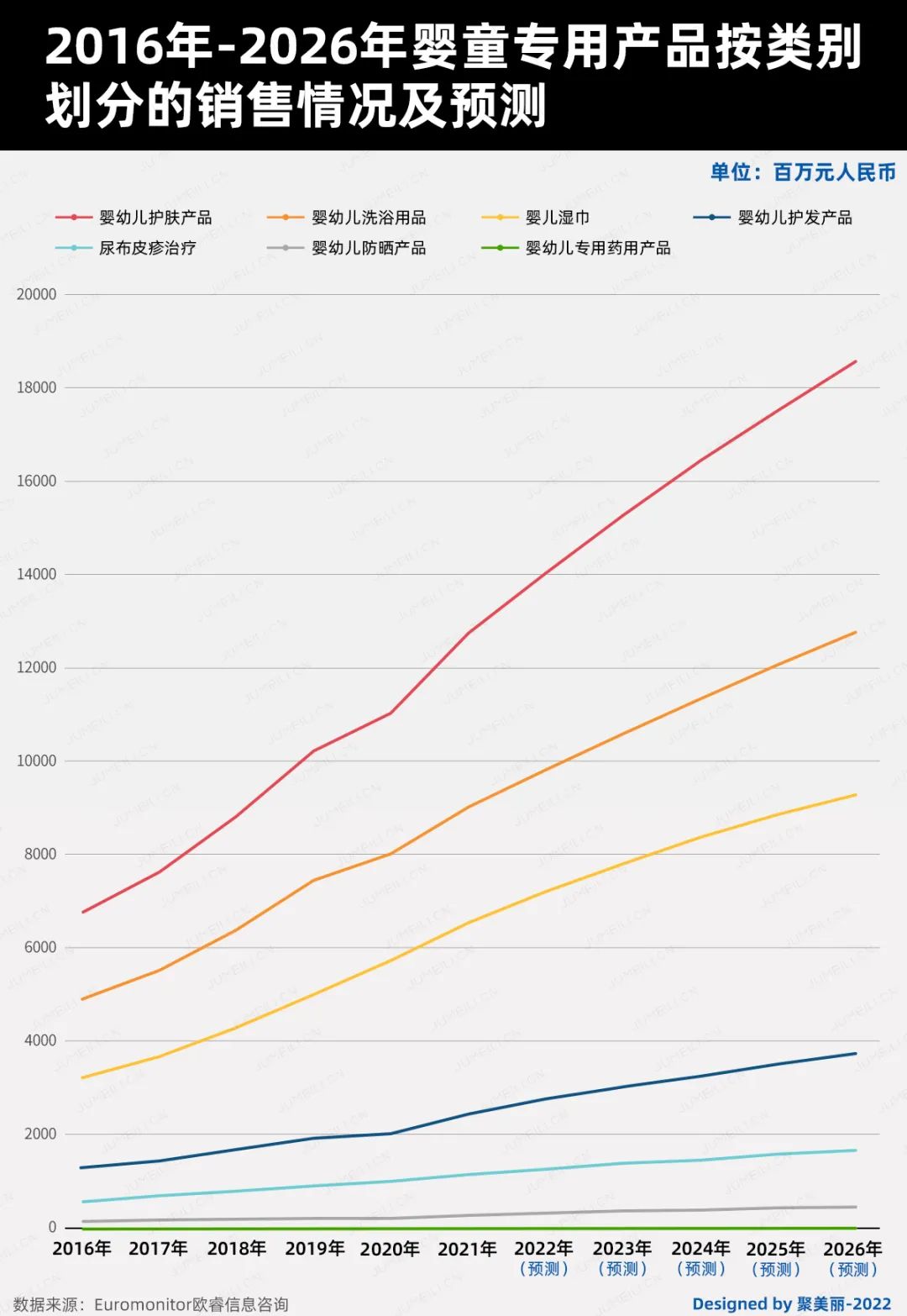 對于2021-2026年的各品類增長預測,如下圖,可以看到嬰童護發(fā)和防曬品類的增速都十分顯著,均在50%之上。