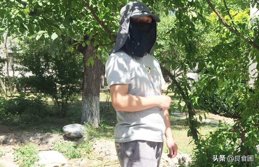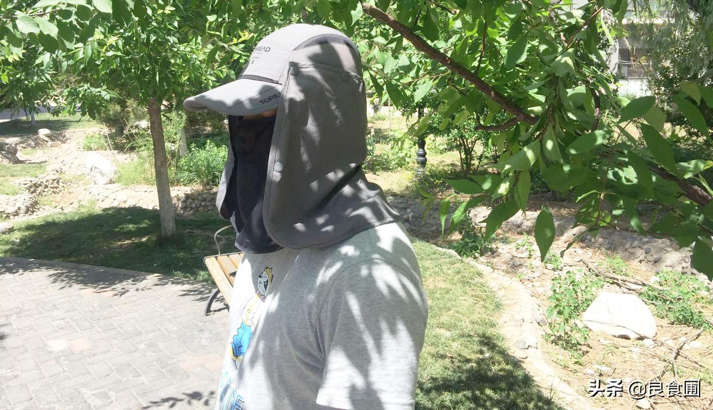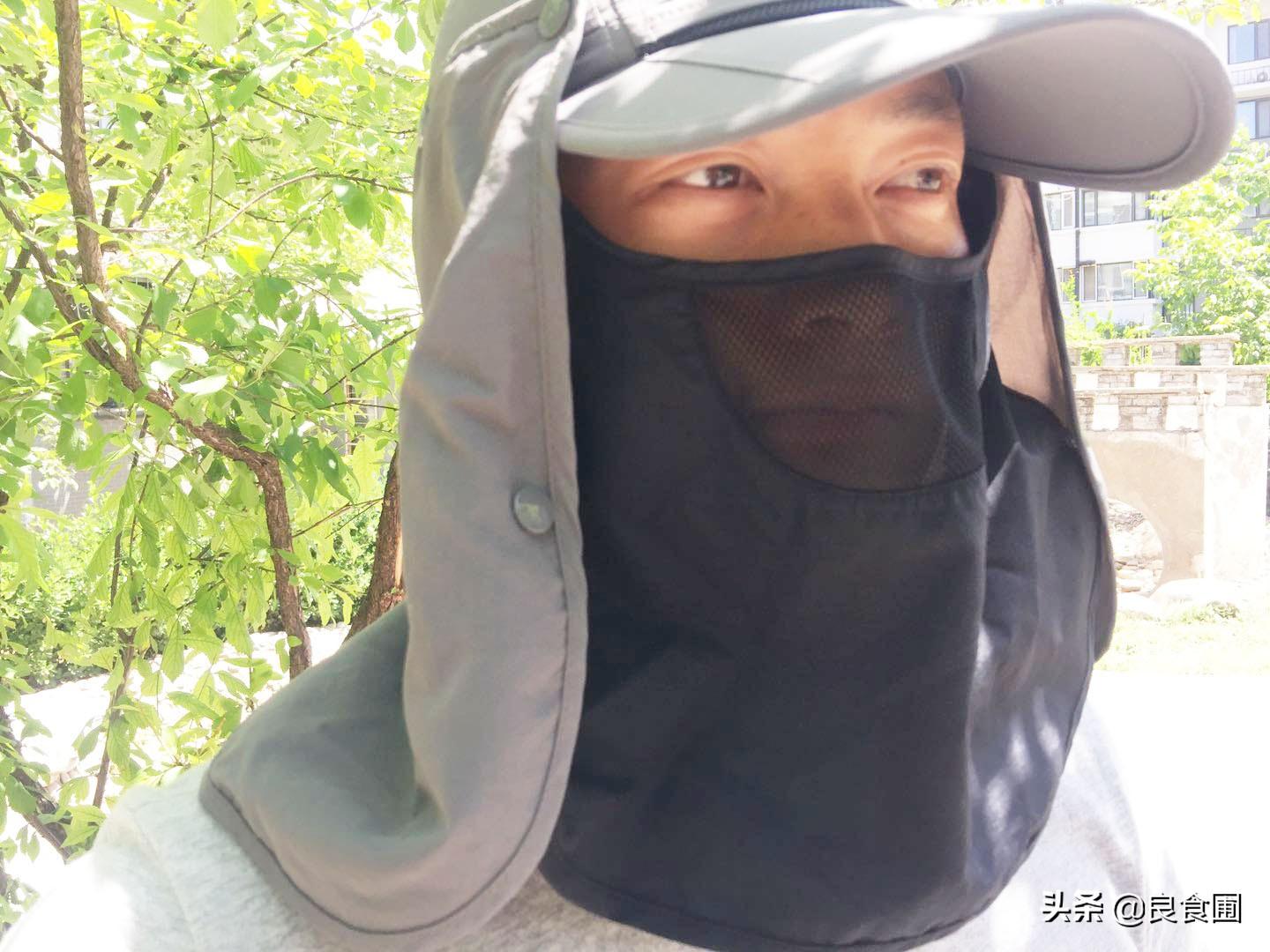 脖頸的遮擋也是充分的,脖子處的面料能夠和面部遮擋的網(wǎng)面通過摁扣連接在一起形成環(huán)形密閉結(jié)構(gòu),不會(huì)隨風(fēng)吹起,遮陽果充分到位。