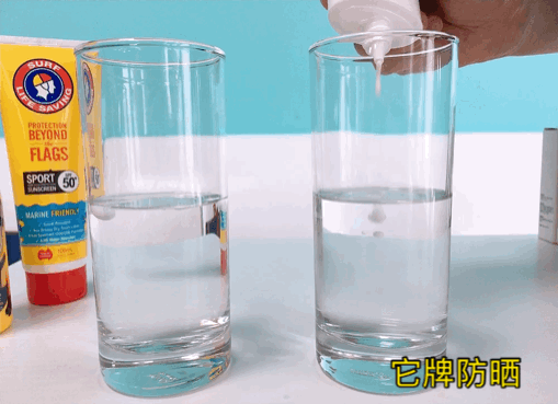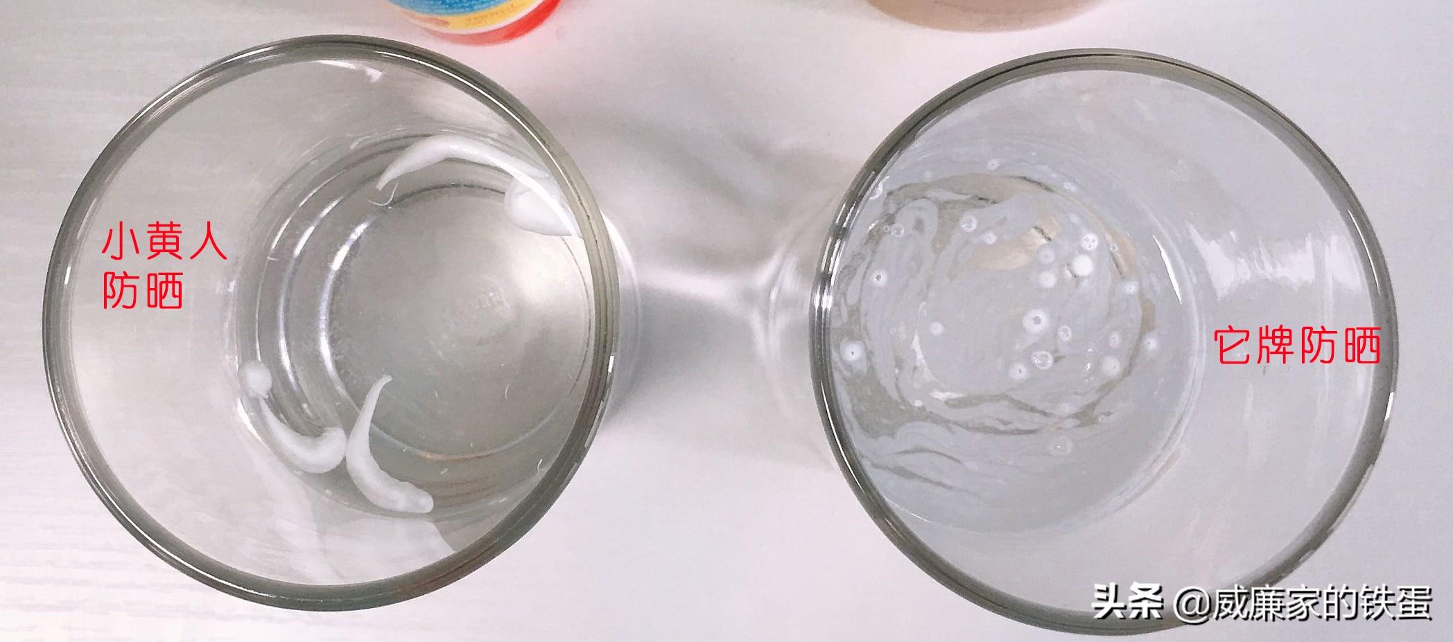把不同的防曬分別投入水中,小黃人的霜體全部浮在水面上,而對比組的霜體秒沉水……說明小黃人的密度比水小,它牌防曬的密度比水大。