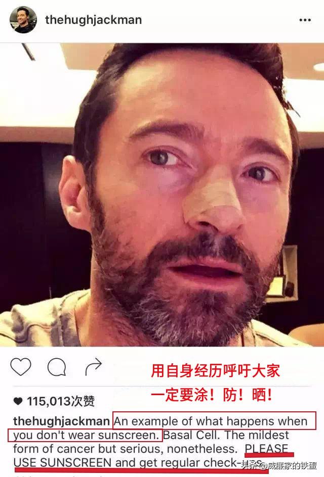 金剛狼休·杰克曼這個土生土長的悉尼人,就不幸中了招。甚至在接下來的3年內6次復發(fā)!他甚至在ins上分享自己的經歷以呼吁大家要注意防曬!