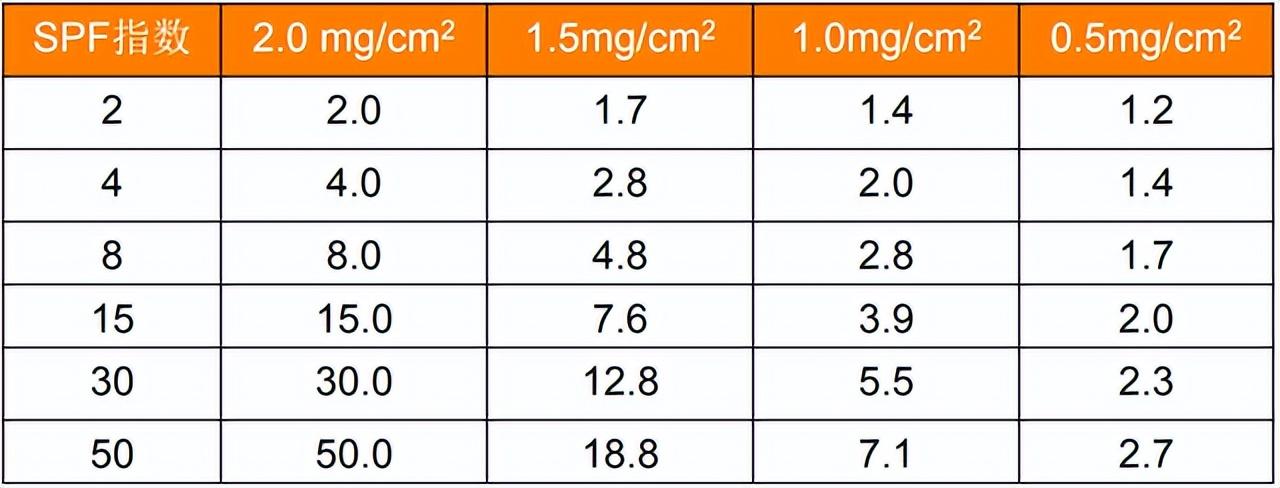 不同SPF值防曬產(chǎn)品涂抹不同厚度所達(dá)到的防曬果(mg/cm2)