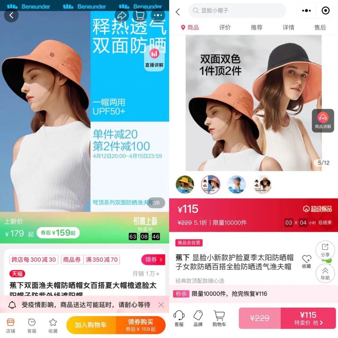 (不同平臺(tái)蕉下商品截圖,左為淘寶,右為唯品會(huì))