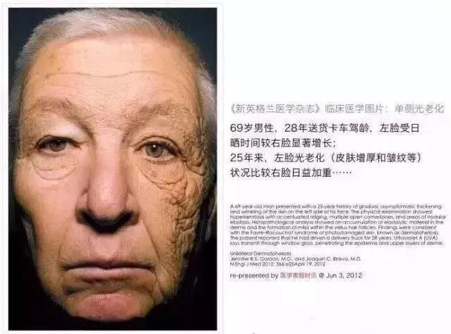 英格蘭的一位送奶工,因?yàn)殚_(kāi)車(chē)時(shí)左臉靠近窗戶(hù)一邊,導(dǎo)致左臉長(zhǎng)期受到紫外線的照射。