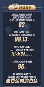 除了玩法精彩,品類日的服務也締造了一份搶鏡數據,在活動期間,使用京東跨境物流,倉配一體服務的商家高達82%,當天直郵訂單報關高達98.13%,保稅備貨訂單從下單到清關成功約半小時即可完成,訂單清關高達96%,在全國重點城市的保稅備貨訂單履約可實現當日達和次日達!