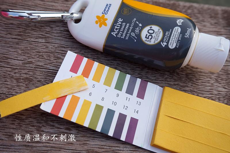 所有Cancer Council的防曬品都依據(jù)現(xiàn)行世界上嚴格的防曬測試條例,不含酒精,防腐劑,色素,香料等敏感成分,無刺激。用PH試紙測試了一下,健康人的皮膚通常呈現(xiàn)中性或弱酸性,所以我們涂在皮膚上的護膚品也應該是近似的酸堿度。經(jīng)過測試,防曬霜的PH值在5—6之間呈弱酸性,溫和無刺激哦,這下可以放心使用啦。