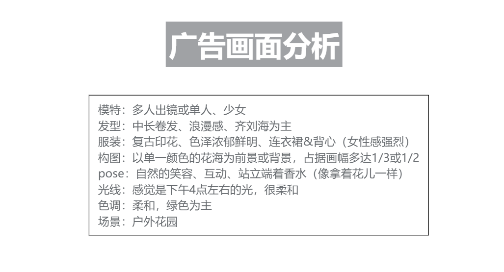 案例假設(shè)你要寫一篇香水的移動(dòng)端圖文內(nèi)容,要求不超過15屏。那么,我們要如何從人格原型出發(fā),思考淡香水的文案表達(dá)方式呢?以下是某品牌香水廣告畫面,我把畫面的要素提取出來放在下面了,它整體傳遞的情緒感受是:少女的慵懶和愜意。
