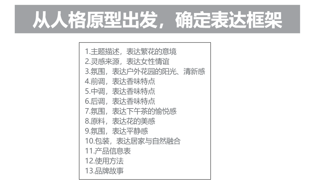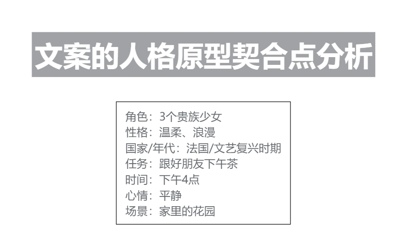 接下來,以“更好地彰顯人格原型特征”為文案出發(fā)點(diǎn),我們進(jìn)一步梳理表達(dá)的框架。我們可以從主題意境、女生情誼、戶外花園的氛圍感、下午茶的愉悅感、強(qiáng)調(diào)家居與自然融合等要素出發(fā)進(jìn)行梳理: