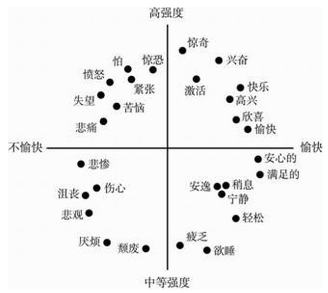 可以參考羅素的情緒環(huán)狀模式圖,他將情緒劃分為四種類型,每種類型下面又有不同的情緒名稱,我們可以針對(duì)想要增強(qiáng)的情緒,加入這個(gè)情緒所對(duì)應(yīng)的元素——