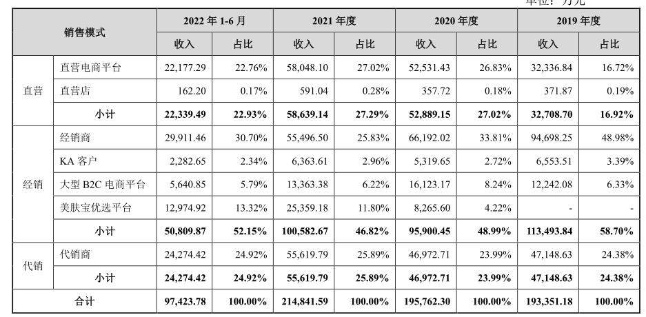 從營(yíng)收占比來(lái)看,經(jīng)銷模式貢獻(xiàn)的收入占到5成以上。2019年,環(huán)亞科技通過(guò)經(jīng)銷模式獲得的收入11.34億元,占主營(yíng)業(yè)務(wù)收入的58.7%。隨著這些年KA渠道和經(jīng)銷商等的采購(gòu)金額下滑,到2022年上半年,經(jīng)銷模式帶來(lái)的收入為5.08億元,占比降至52.15%。