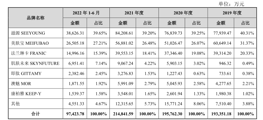 滋源、美膚寶及法蘭琳卡三大品牌的銷售額,過(guò)去占到9成以上,目前這個(gè)比例已經(jīng)下滑至82.25%。