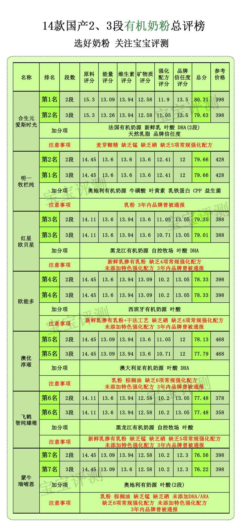 ①合生元愛(ài)斯時(shí)光、明一牧欄純、紅星歐貝星,這3款在國(guó)產(chǎn)有機(jī)奶粉1、2、3段橫評(píng)中均排在前3位。