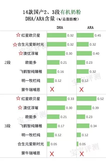 ②紅星歐貝星2-3段、澳優(yōu)淳璀2-3段、合生元愛(ài)斯時(shí)光2段,DHA添加量較高,得到額外加分(☆)。