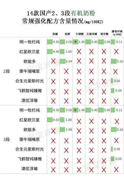 ①常規(guī)強(qiáng)化配方,即雖然在國(guó)標(biāo)中不是必需成分,但大多數(shù)奶粉都會(huì)添加的營(yíng)養(yǎng)物質(zhì),包括:膽堿、肌醇、牛磺酸、左旋肉堿、核苷酸和膳食纖維。添加常規(guī)強(qiáng)化配方不額外加分,只有達(dá)到一定量才加分。