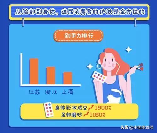 從臉部到身體,淘寶為7億消費者提供了的護膚體驗。江蘇、浙江和上海是護膚剁手力強大的三個省市。今年上半年,購身體彩妝成交翻了近20倍,足部磨砂同比增長1180%。