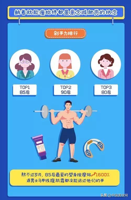 管不住嘴又熬不過歲月的85后開始尋找躺著就能瘦的神器。今年上半年,淘寶購平臺上塑身按摩貼成交金額同比暴增1600%。意大利男士馬甲線腹肌霜成為了新晉網(wǎng)紅,開始焦慮身材的85后男性期待用上它就能擁有“現(xiàn)男友同款”8塊腹肌。